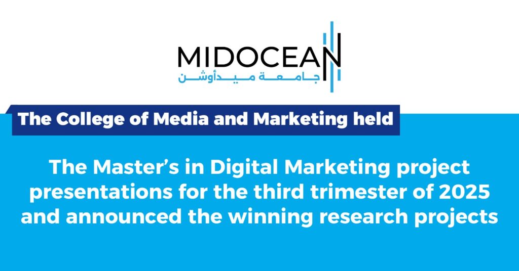 On Wednesday, December 24, 2025, the College of Media and Marketing hosted the graduation project discussion session for the Master’s in Digital Marketing program, attended by faculty members and the judging committee. The session featured a range of specialized academic research studies addressing contemporary issues in digital marketing, modern media, consumer behavior, and advanced marketing technologies.